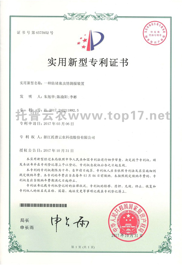 繼智能識別蟲情測報燈控制軟件獲得國家版權局軟件著作權后,托普云農在蟲情測報領域再取得新突破。10月31日,由托普云農研發的“一種防堵塞蟲情測報裝置”,獲得國家知識產權局實用新型專利授權,授權專利號:ZL 2017 2 0211882.5。