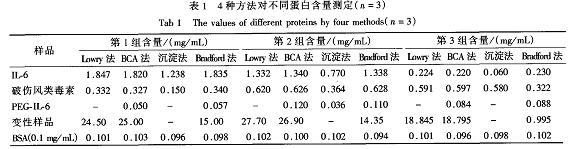 蛋白濃度測(cè)定方法有很多種,各種蛋白質(zhì)含量測(cè)定的研究也屢見報(bào)道。每種方法都有其優(yōu)點(diǎn)和局限性,在蛋白質(zhì)樣品中往往會(huì)含有一些化學(xué)試劑,有些化學(xué)試劑會(huì)干擾蛋白濃度測(cè)定。因此,尋找合適的實(shí)驗(yàn)方法以避免干擾對(duì)蛋白濃度測(cè)定的準(zhǔn)確性至關(guān)重要。基于Lowry法在測(cè)定PEG_IL_6樣品時(shí)出現(xiàn)大量黃綠色沉淀,尿素對(duì)BCA法測(cè)定蛋白濃度測(cè)定有嚴(yán)重干擾,影響結(jié)果準(zhǔn)確性,我們?cè)囼?yàn)了外兩種方法,并進(jìn)一步對(duì)方法進(jìn)行了比較分析。