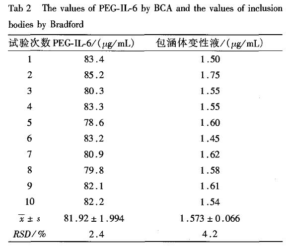 表2 BCA法測(cè)定PEG-IL-6和Bradford法測(cè)定包涵體變性液中蛋白濃度的重復(fù)性結(jié)果