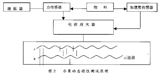 在不同預加載荷、激振功率、成熟程度等條件下,測定動態試驗的彈性模量和相位角。測試原理是正弦交變應力- 應變動態試驗作軸向加載時,正弦力由正弦波發生器經過放大器后,由電動式振蕩器產生,一個壓電加速度傳感器固定到振蕩器軸上,樣品夾在兩個圓盤之間,一個圓盤連接到振動器上,另一個經動態力傳感器連接到剛性支撐之間,以測定靜態預載荷,加速度和力傳感器的信號經放大,通過水平和垂直通道輸入存儲示波器,通過調節功率放大器改變激振功率(測定輸入激振器的功率獲得激振功率),見圖2 。