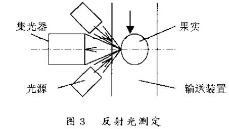 在線近紅外線內部品質檢測技術分為反射光式和透過光式,透過光式又分為不完全遮光式和完全遮光式。反射光式測定法是將近紅外線照射在果實赤道附近部位,并測定經內部擴散之后由果實表面反射光線的一種方法,檢測原理如圖3 所示。輸送裝置將果實輸送到糖度檢測裝置處,照射在果實上的近紅外光線經果實反射后,由集光器聚集,然后經過分光器(濾波器),僅取出一實波長的近紅外線。濾波后的光線由光電元件變換成電信號,從而求出不同波長下的反射強度,再依據事先建立的多元回歸糖度計計算模型(標定線)由反射強度推算出糖度。