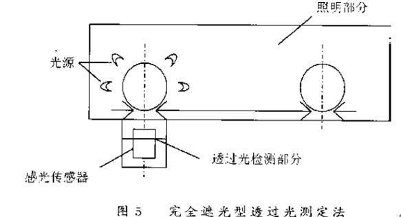 完全遮光式透過光測定法測試原理如圖5 所示,兩組呈水平圓弧狀排列的光源位于輸送裝置的上方,且對稱排列在輸送裝置的兩側,水果由人工放在輸送裝置的果斗上。果斗中部有垂直通孔,與水果接觸的表面內側為海綿材料,可使水果表面與果斗緊密貼合;透過光測定部分位于輸送裝置的下方。水果隨輸送裝置運動到測定裝置時,水果周圍呈圓弧狀排列的光線均勻地照射在水果表面,透過水果內部的透過光,經果斗中部通孔由感光傳感器檢測。