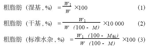 粗脂肪濕基含量、干基含量和標(biāo)準(zhǔn)水雜含量分別按公式(1) 、(2) 和(3) 計算: