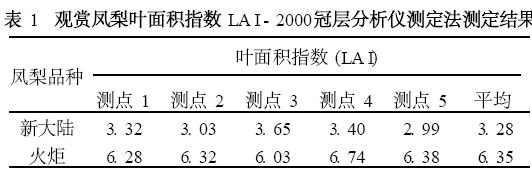 2. 1 LA I - 2000冠層分析儀測(cè)定法的測(cè)定結(jié)果采用LA I - 2000冠層分析儀測(cè)定所得觀賞鳳梨品種“新大陸”和“火炬”的葉面積指數(shù)結(jié)果見(jiàn)表1。