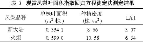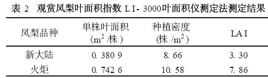 2. 2 L I - 3000葉面積儀測(cè)定法的測(cè)定結(jié)果用L I - 3000葉面積儀測(cè)得單株鳳梨的葉面積,然后根據(jù)種植密度,計(jì)算LA I。葉面積指數(shù)(LA I) =單株葉面積(m2 /株) ×種植密度(株/m2 )