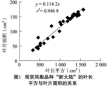 1. 3. 3 回歸方程測(cè)定法原理 觀賞鳳梨的葉片呈劍形,為有規(guī)則的幾何形狀。其葉片面積與葉片長(zhǎng)度之間存在著顯著正相關(guān)關(guān)系,并且對(duì)于特定品種,其葉片面積與長(zhǎng)度之間的相關(guān)關(guān)系應(yīng)該是固定不變的。因此以葉長(zhǎng)的平方作為自變量,以單葉面積作為應(yīng)變量,建立特定品種的回歸方程后,即可根據(jù)葉片長(zhǎng)度,運(yùn)用此方程計(jì)算單株葉面積,再結(jié)合種植密度,得到葉面積指數(shù);貧w方程的獲得需要葉長(zhǎng)和單葉面積的數(shù)據(jù)進(jìn)行回歸分析,本研究中,隨機(jī)選擇了不同植株上的30片不同大小、不同年齡的觀賞鳳梨葉片,先測(cè)量其葉長(zhǎng),然后通過(guò)葉形紙稱重法得其單葉面積。葉形紙稱重法利用以下公式計(jì)算葉片的葉面積:葉片面積= (1張白紙面積×葉形紙重) /1張白紙重。葉形紙稱重法是一種比較準(zhǔn)確但耗時(shí)耗力的方法,實(shí)際應(yīng)用不多。本研究之所以選用這種方法,是為了便于與LA I - 2000冠層分析儀法和L I- 3000葉面積儀法所得到的葉面積指數(shù)進(jìn)行比較。