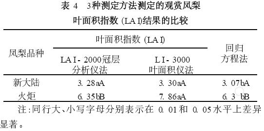 從表4可以看出,“新大陸”品種, 3種方法測(cè)定的結(jié)果在0. 01水平上沒(méi)有顯著差異;而“火炬”品種,L I - 3000葉面積儀法與另外2種方法的測(cè)定結(jié)果在0. 05和0. 01水平都存在顯著差異。總體上,L I - 3000葉面積儀法的測(cè)定結(jié)果均高于LA I - 2000冠層分析儀法和回歸方程法。