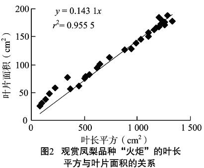 2. 3. 1 回歸方程的獲得 由圖1和圖2可知,“新大陸”和“火炬”2個(gè)觀賞鳳梨品種葉長(zhǎng)的平方與葉片面積都存在著顯著的線性相關(guān)關(guān)系。“新大陸”品種,由葉長(zhǎng)計(jì)算葉片面積的公式為:葉面積(LA)= 0. 114 2 ×葉長(zhǎng)平方(L2 ) , r2 = 0. 946 8;“火炬”品種,由葉長(zhǎng)計(jì)算葉片面積的公式為:葉面積(LA) =0. 143 1 ×葉長(zhǎng)平方(L2 ) , r2 = 0. 955 5。