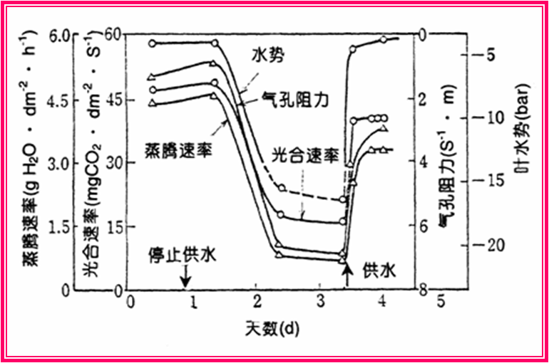 當(dāng)土壤水分不足,蒸發(fā)作用過(guò)于旺盛:無(wú)法將作物所需的元素正常的運(yùn)輸?shù)街参镄枰牡胤剑热缬坠约坝酌纾侵参锊荒苷5纳L(zhǎng)。同時(shí)水分不足還影響著植物的有機(jī)物質(zhì)即光合作用的正常進(jìn)行。水分虧缺會(huì)使光合速率下降。在水分輕度虧缺時(shí),供水后尚能使光合能力恢復(fù),倘若水分虧缺嚴(yán)重,供水后葉片水勢(shì)雖可恢復(fù)至原來(lái)水平,但光合速率卻難以恢復(fù)至原有程度,下圖就是土壤水分缺損以及修復(fù)水分過(guò)程中,植物光合作用以及其他的一些生理反應(yīng)的過(guò)程:
