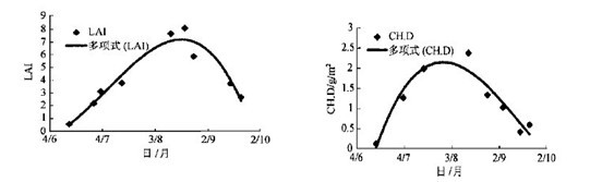 在水稻的光合作用過程中影響水稻有機(jī)物質(zhì)合成的主要因素有葉面積(LAI)、葉綠素含量(CH.D)、陽光、二氧化碳的濃度等,在光合反應(yīng)過程中葉面積過大也不一定會利于植物的有機(jī)物質(zhì)的合成,而水稻的葉面積以及葉綠素含量增加有一定的規(guī)律的,通過使用便攜式葉面積測定儀對水稻的葉面積來進(jìn)行測量,接著通過使用葉綠素計(jì)來對葉綠素含量進(jìn)行測量,得出如下圖顯示:
