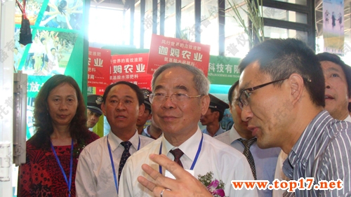 圖為:原農業部陳耀邦部長(左二)在全國農技推廣服務中心夏敬源主任(左三)、栗鐵申副主任(右二)、首席專家彭世琪女士(右一)等陪同下參觀托普展位。