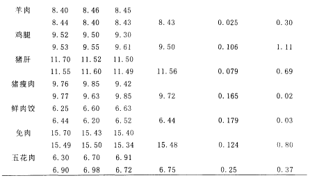 對不同種類的肉類樣品,分別用半微量定氮法和自動定氮儀測定抨發性鹽基氮含址,結果基本一致,經配對檢驗,P> 0.05,證明該兩種方法測定結果無顯著性差異,符合方法的要求。