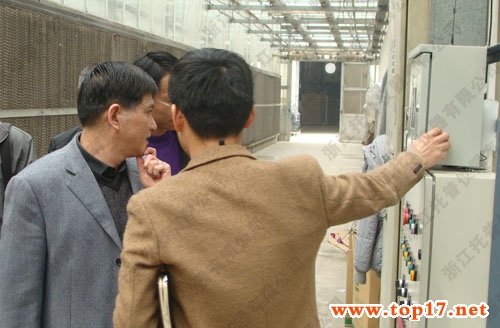 圖為:托普工作人員在介紹通過(guò)網(wǎng)絡(luò)來(lái)控制種植大棚里的各項(xiàng)指標(biāo),右二:戴守勤副處長(zhǎng)