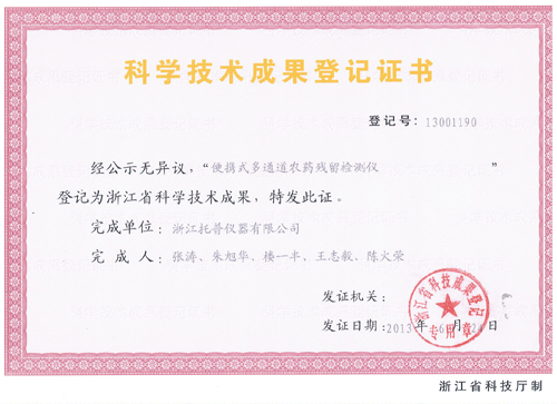 熱烈祝賀托普便攜式多通道農(nóng)藥殘留檢測(cè)儀獲得科學(xué)技術(shù)成果登記證書