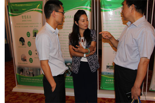 圖為:陳渝陽總經理(右二)和王建躍(右一)副廳長交流物聯網在農業生產中的應用情況
