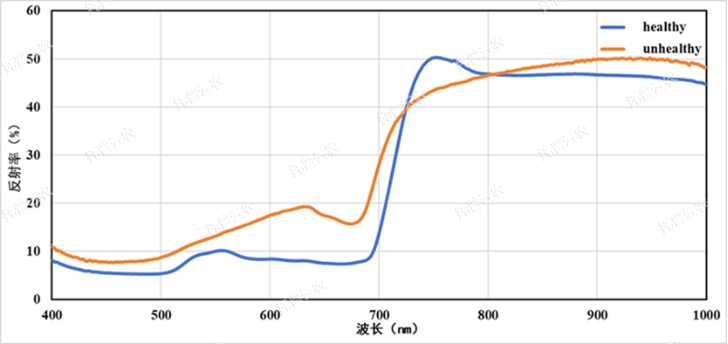 7.病蟲害分析:可適用于植物病蟲害試驗,進行病斑部分和健康部分光譜反射曲線進行對比,通過對變化趨勢的研究可以對病害發生部分和嚴重程度進行分析;