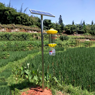 頻振式太陽能殺蟲燈是利用害蟲趨光性進(jìn)行誘殺的一種物理防治方法。利用害蟲較強(qiáng)的趨光、趨波、趨色、趨性信息的特性,將光的波長、波段、波的頻率設(shè)定在特定范圍內(nèi),近距離用光、遠(yuǎn)距離用波,加以誘到的害蟲本身產(chǎn)生的性信息引誘成蟲撲燈,燈外配以頻振式高壓電網(wǎng)觸殺,使害蟲落入燈下的接蟲袋內(nèi),達(dá)到殺滅害蟲的目的。