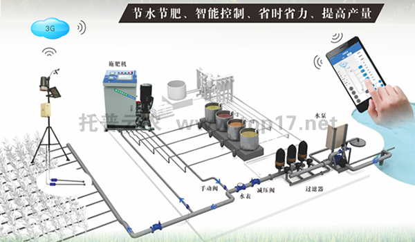 托普水肥一體化智能灌溉系統可以幫助生產者很方便的實現自動的水肥一體化管理。系統由系統云平臺、墑情數據采集終端、視頻監控、施肥機、過濾系統、閥門控制器、電磁閥、田間管路等組成。