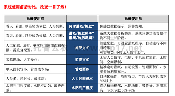 整個系統可根據監測的土壤水分、作物種類的需肥規律,設置周期性水肥計劃實施輪灌。施肥機會按照用戶設定的配方、灌溉過程參數自動控制灌溉量、吸肥量、肥液濃度、酸堿度等水