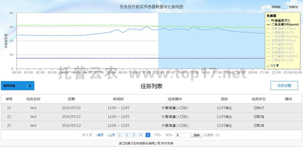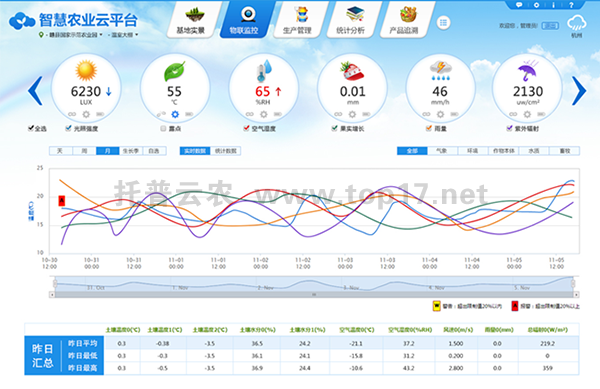 可選擇種植地塊、作物、傳感器、圖表展示、數字列表展示,還可選擇時間段(最近一天、一周、一個月);